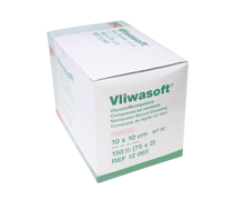 En kartong med sterila 10x10 cm stora nonwovenkompresser.