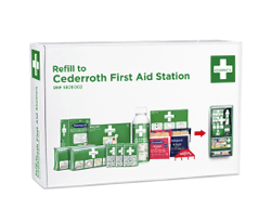 Paket med refilprodukter till Cederroth Förstsa Hjälpen Station (REF 490920) har uppdaterats och innehåller numera även Eye & Wound Cleansing Spray samt Burn Gel Dressing. Artikeln ersätter REF 492640.