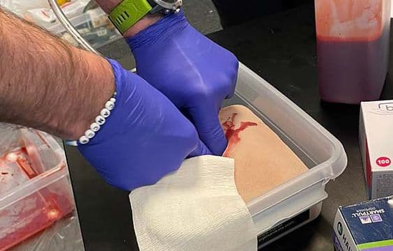 Utbildningen inkluderar både grundläggande första hjälpen vid blödningar och praktisk träning med tourniqueter (avsnörande förband) och sårskademoduler.